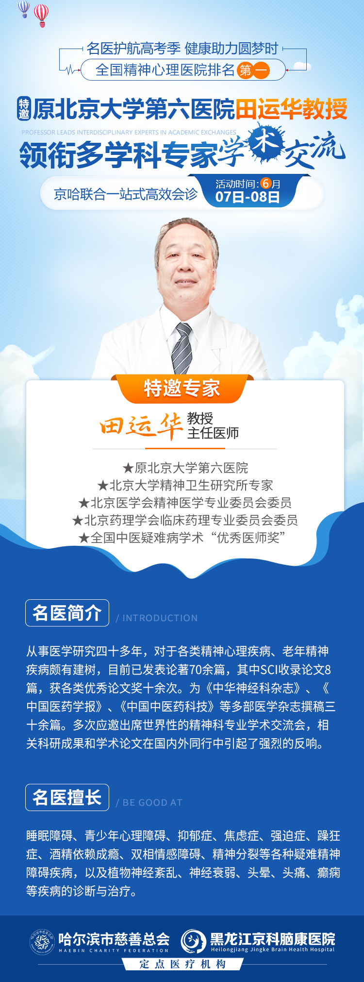 在孩子們經(jīng)歷高考這場身心巨變的關(guān)鍵時(shí)刻,6月7日-8日(僅兩天?。?,我們鄭重邀約原北京大學(xué)第六醫(yī)院精神科權(quán)威專家田運(yùn)華教授親臨本院,開展特別會(huì)診活動(dòng)。